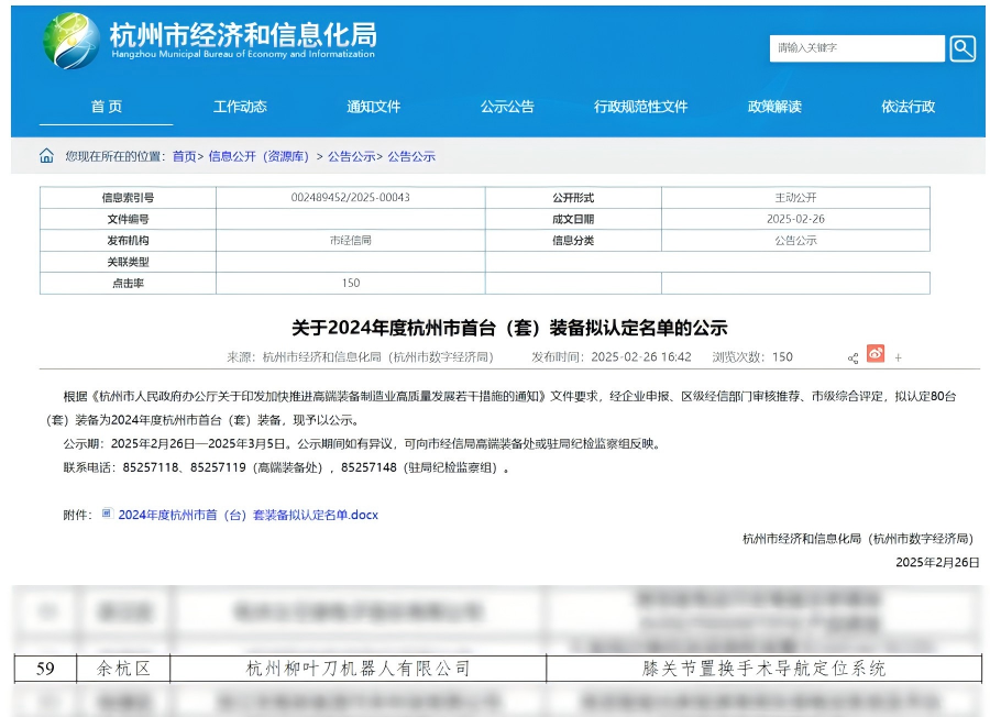 【喜报】柳叶刀机器人获2024年度杭州市首台(套)装备认定